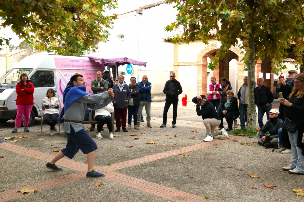 « La bastide de Villefranche-du-Queyran n’est pas un témoin figé du passé mais elle vit, elle crée du lien ». Le programme complet de dimanche 26 octobre a permis de mettre en évidence l’objectif de la 2e édition de « Bastides en fête » qui a été le fil rouge aux 20 bastides participantes du département. Dès dimanche matin, une trentaine de personnes ont participé à une randonnée de 6 kilomètres pour une découverte du patrimoine historique et paysager. La rencontre « Ânartiste » avec la plasticienne Edel Truda et son âne Kraft a apporté un moment poétique et décalé. L’art était à l’honneur sous la halle avec Jean-Pierre Plazas, Rafiou Gbadamassi, Adjoa et Nicole Médail ainsi que dans l’église Notre-Dame avec les tableaux de Masutti. En début d’après-midi, Aymric Faure et Franck Lunven de la compagnie Tmp productions ont présenté un spectacle médiéval comique « Le Franc-tireur de Bagnolet ». La musicienne Célia Gapail a entraîné de nombreux participants dans des pas de danses traditionnelles. « C’est ça la vie de bastide » ont voulu exprimé les organisateurs.